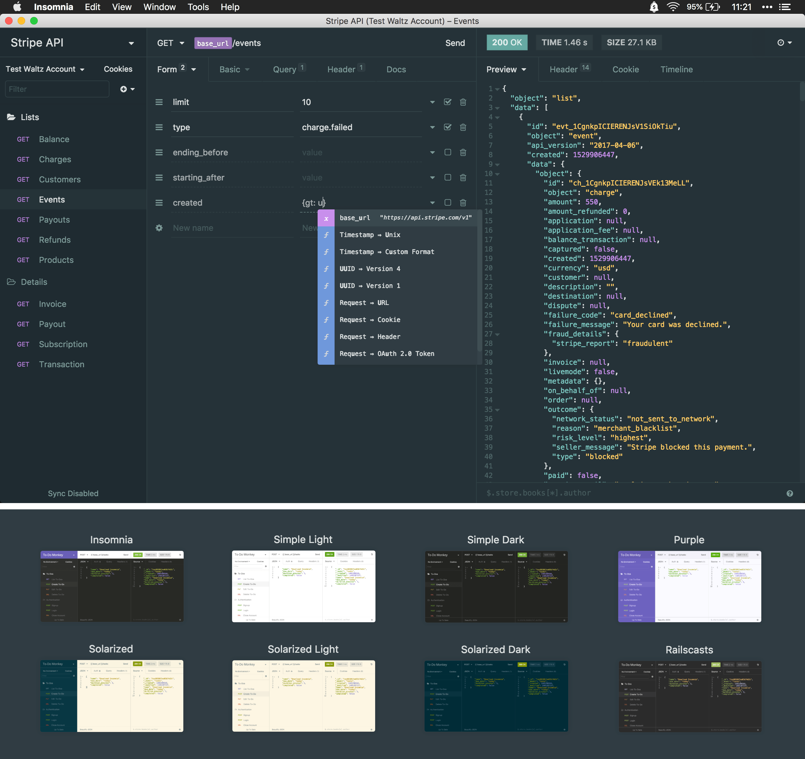 Insomnia is a REST client for working with APIs. It’s way more efficient than crafting CURL requests manually in a text editor. The beautiful user interface makes it a pleasant experience.